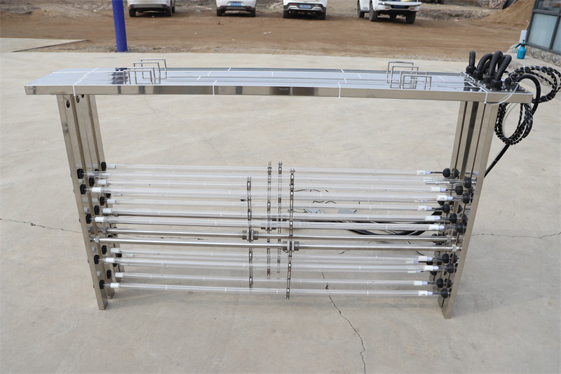 我公司生产的型号为SW紫外线杀菌器适用于城市污水、水区生活污水、工商业污水的消毒处理。该设备采用美国进口的低压高能的紫外线灯管和相匹配的镇流器,灯管的有效使用寿命可达到12000小时。设备为模块式,可置放于明渠中对污水进行杀菌处理。每个紫外线水槽中可以设置多个紫外线组,每组又由多个紫外线模块。
